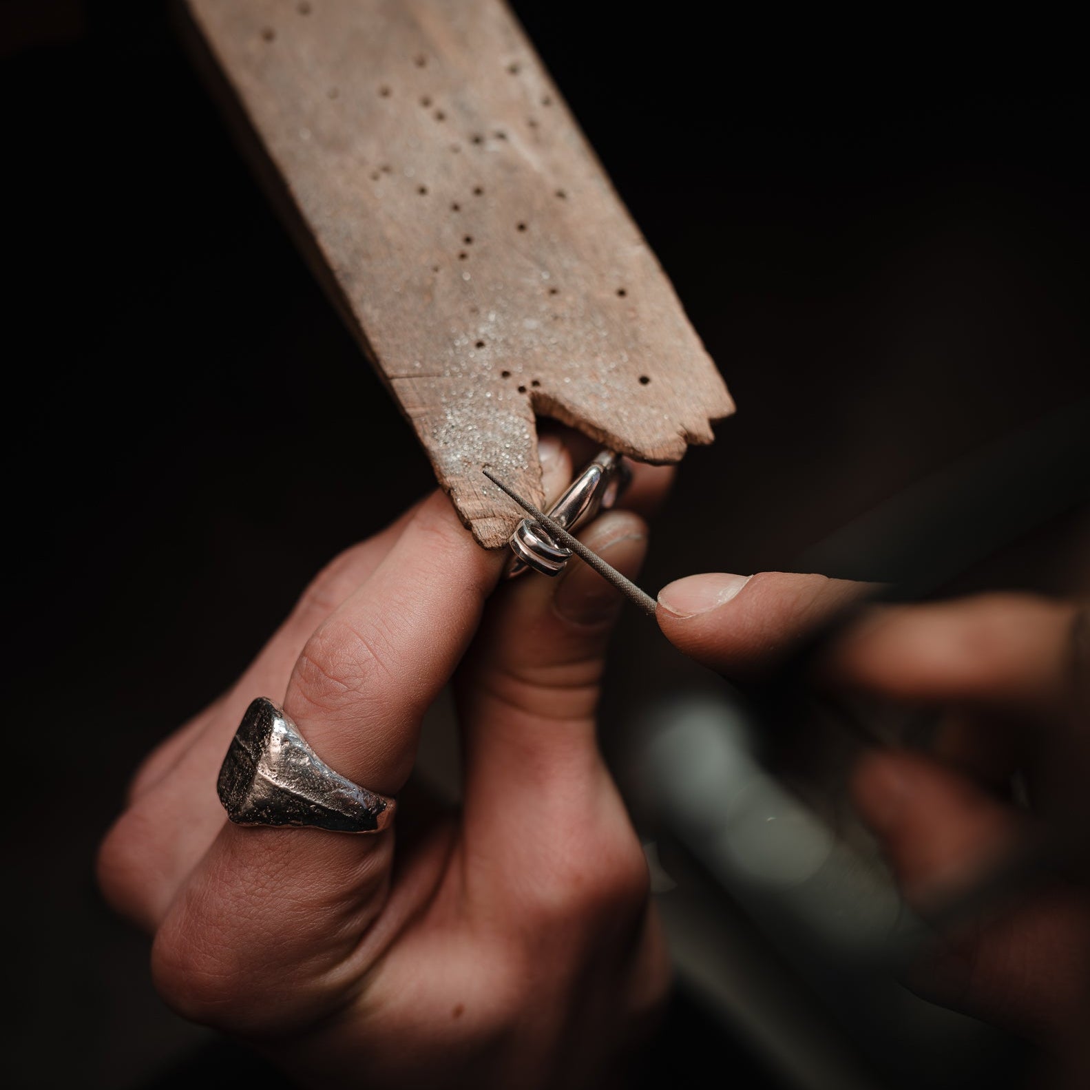 Die unregelmäßige Form und die rohe, strukturierte Oberfläche entstehen direkt im handwerklichen Prozess, jedes Stück ein kleines Unikat.